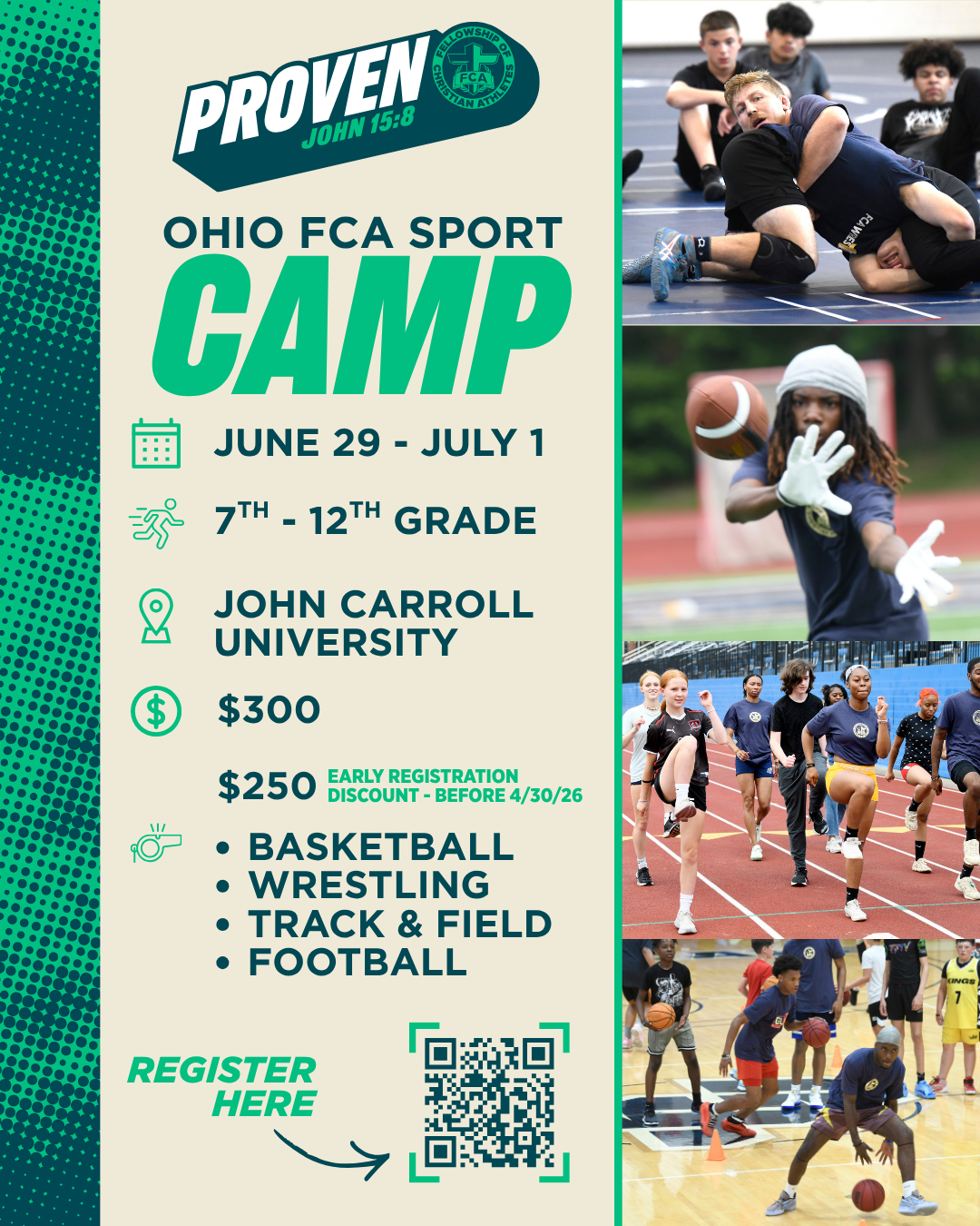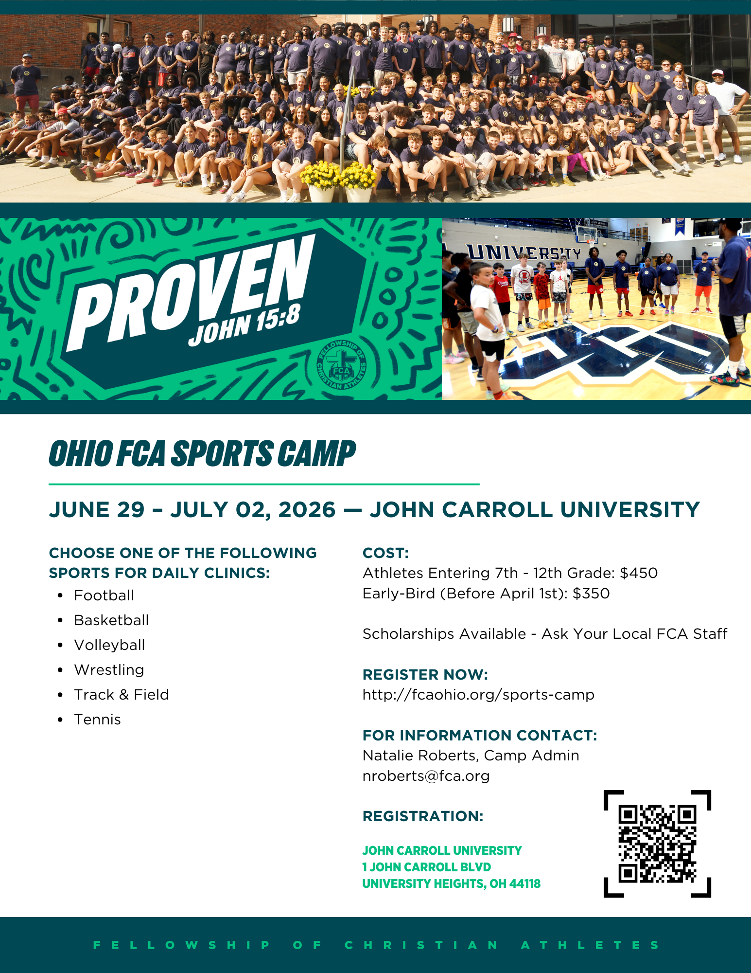 Join us for an unforgettable Ohio FCA Sports Camp at John Carroll University June 29 - July 2, 2026! This 4-day,