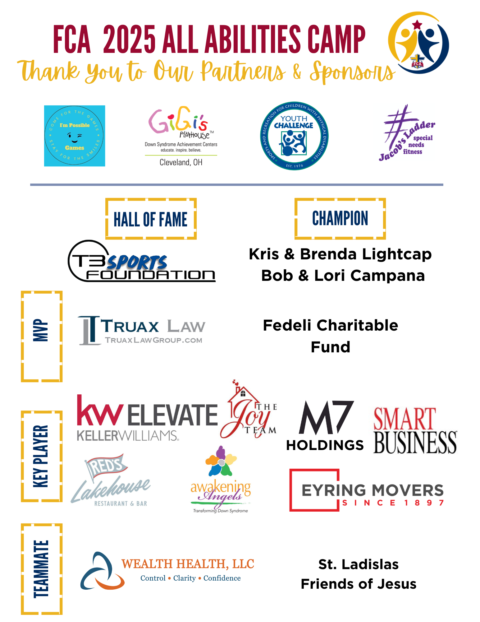 We believe that God is leading more people and organizations to become involved with camp, and with that in mind, we would like to invite you to serve as a Sponsor for this camp. Sponsors play a role in camp by underwriting the financial expenses of camp and providing resources for the growth of FCA’s programs beyond camp. Your willingness to partner with us as a sponsor allows this camp to have the greatest impact and reach its highest potential by giving attendees an opportunity to hear the Gospel and experience FCA free of cost. The attached sponsorship information document features a variety of sponsorship levels available.
